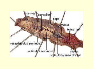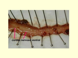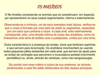 O documento descreve as principais características do filo Anelida, dividido em três classes: Oligoquetos como as minhocas, Poliquetos marinhos com muitas cerdas, e Hirudíneos como as sanguessugas sem cerdas e com ventosas.
