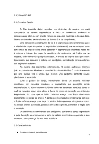 1. O documento descreve o filo Annelida, que inclui minhocas, sanguessugas e outros vermes segmentados.