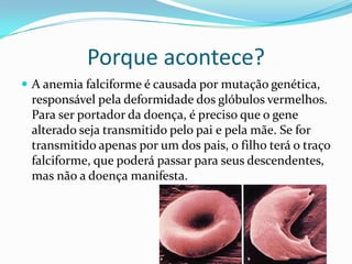 A anemia falciforme é causada por uma mutação genética que deforma os glóbulos vermelhos. Provoca sintomas como dores intensas, fadiga, palidez e aumenta o risco de infecções. O diagnóstico é feito por exames de sangue e não tem cura, mas o tratamento busca controlar as crises de dor e prevenir complicações.
