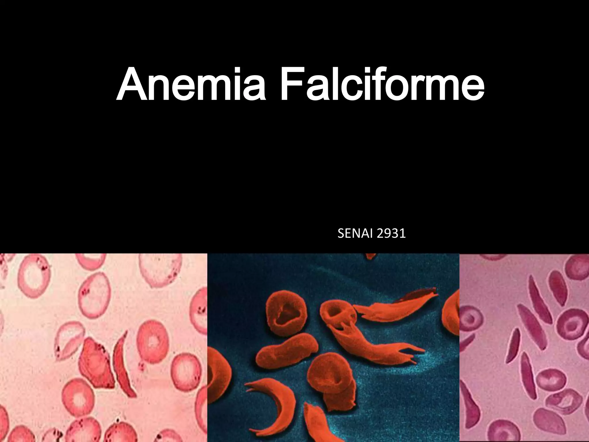 A Anemia Falciforme é uma doença genética e hereditária onde há uma mutação no gene que causa alterações nos glóbulos vermelhos, predominante em negros. Os sintomas incluem palidez, icterícia, infecções, dores e fadiga, e a expectativa de vida é de cerca de 40 anos.