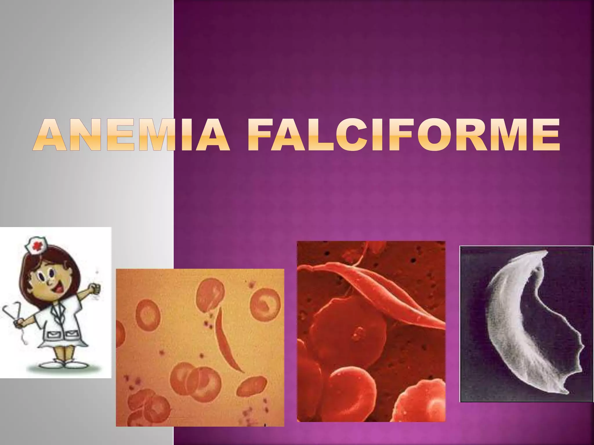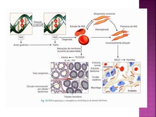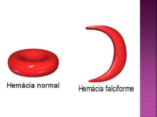A anemia falciforme é uma doença hereditária causada por uma mutação genética que resulta na produção anormal da hemoglobina S. Ela se caracteriza pela destruição prematura dos eritrócitos frágeis e pouco deformáveis, podendo causar diversas complicações como crises de dor, seqüestro esplênico e úlceras de perna. O diagnóstico é feito por meio de exames laboratoriais como eletroforese de hemoglobina e teste do pezinho.