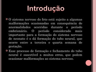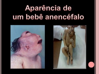 Este documento discute a malformação anencefalia, incluindo suas causas, diagnóstico pré-natal, prevenção através do consumo de ácido fólico, e a decisão da OAB de não considerar a interrupção da gravidez de fetos anencefálicos como aborto.