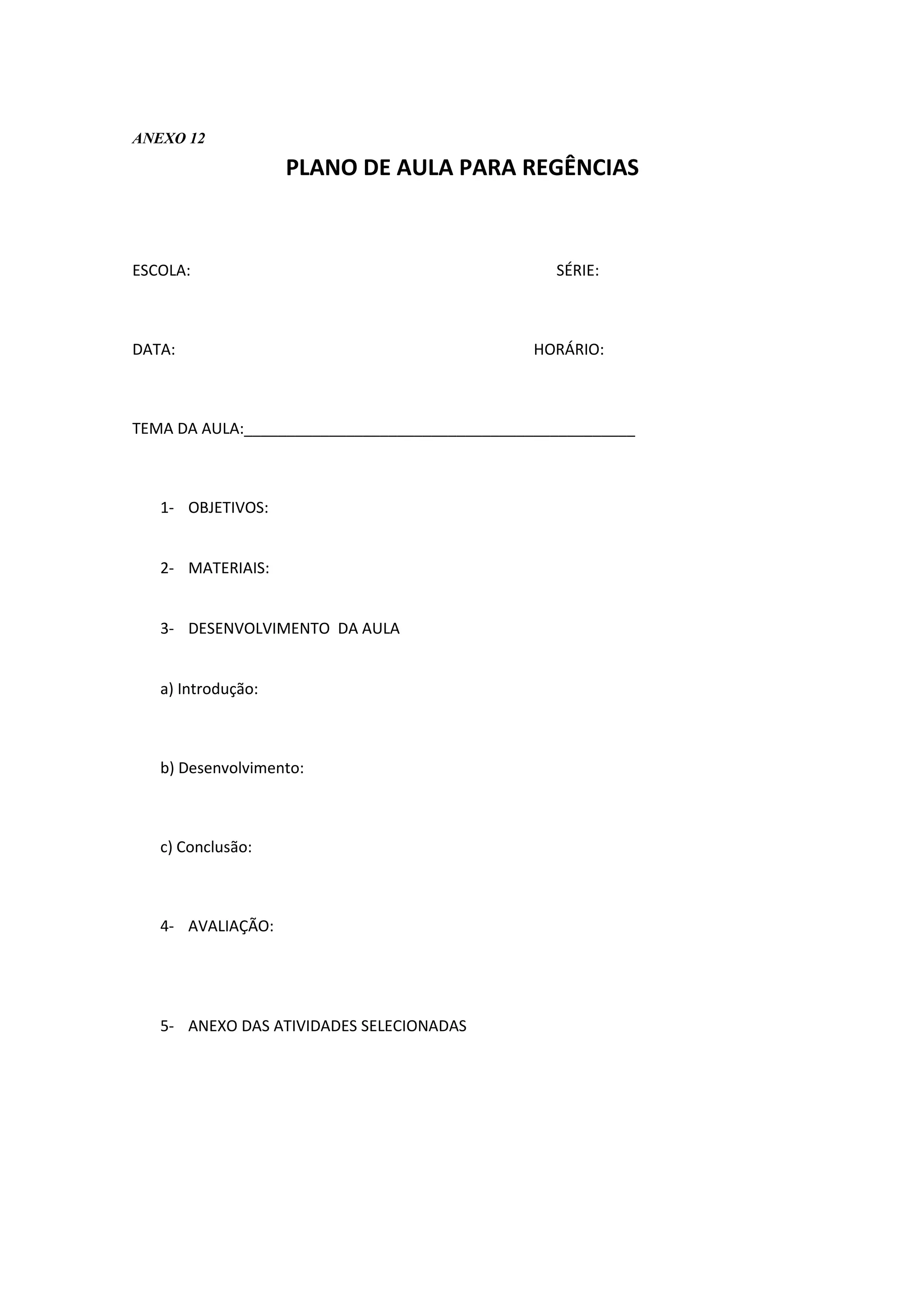 O documento fornece um modelo de plano de aula para regências, incluindo seções para objetivos, materiais, introdução, desenvolvimento, conclusão e avaliação da aula, além de um anexo de atividades selecionadas.