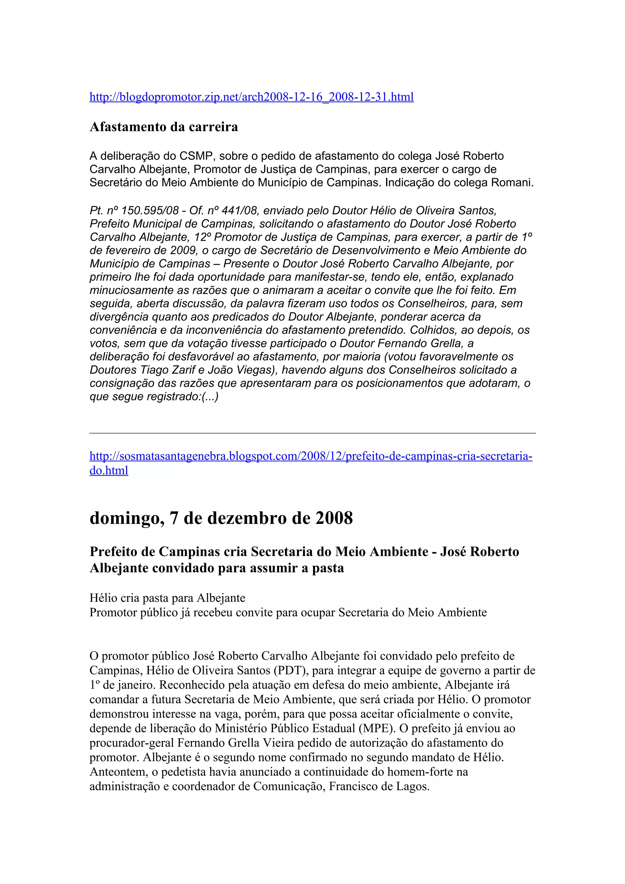 O Conselho Superior do Ministério Público de São Paulo deliberou desfavoravelmente sobre o pedido de afastamento do Promotor de Justiça José Roberto Carvalho Albejante para assumir o cargo de Secretário do Meio Ambiente de Campinas. O Prefeito de Campinas convidou Albejante, reconhecido por sua atuação em defesa do meio ambiente, para comandar a nova Secretaria de Meio Ambiente. Albejante demonstrou interesse na vaga, mas depende de autorização do Conselho Superior do MP.
