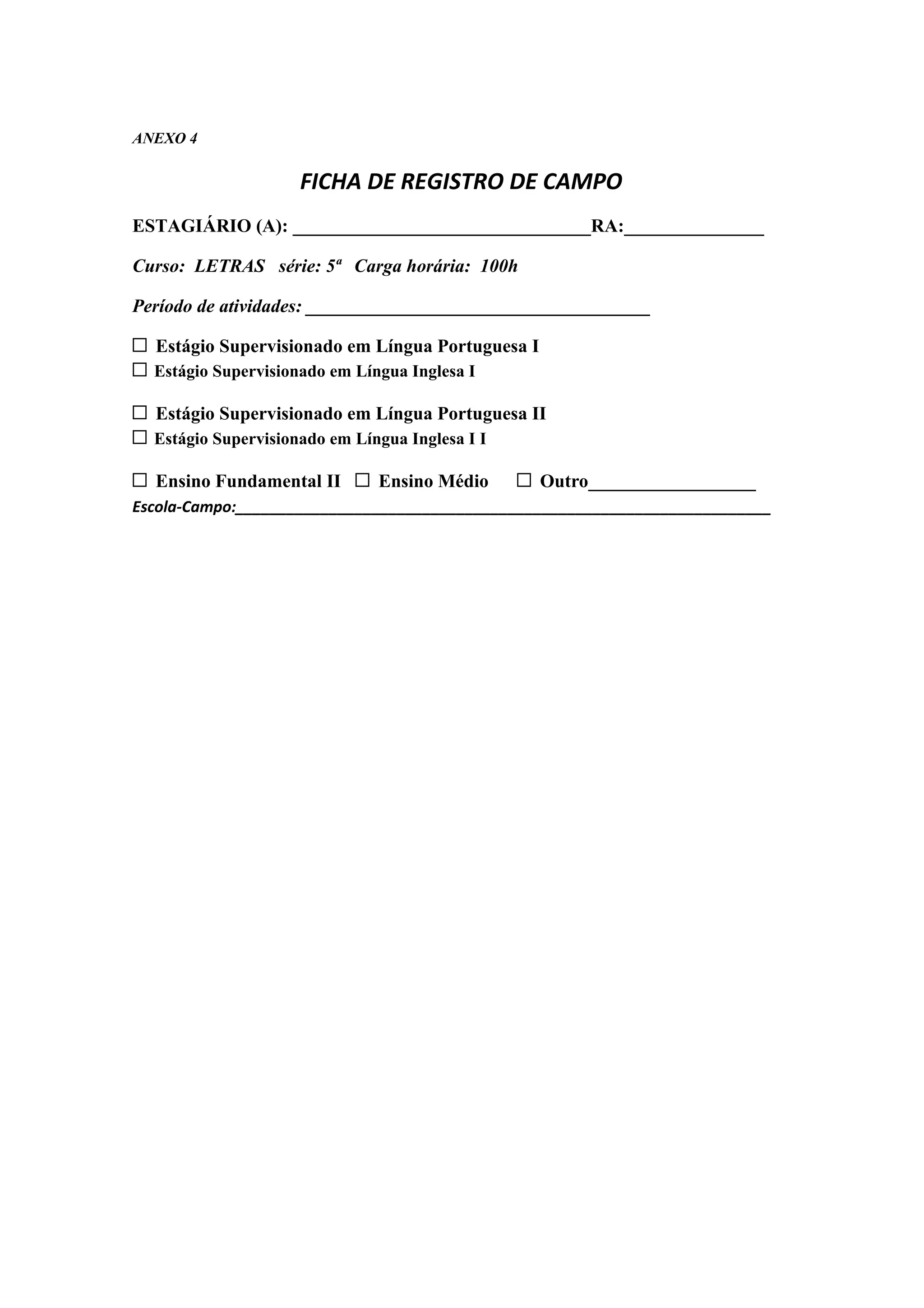 Este documento é uma ficha de registro de campo para um estagiário, que inclui informações como nome do estagiário, curso, período de atividades, escola de estágio, datas e horas de atividades realizadas, assinaturas de aprovação e cálculo total de horas realizadas.