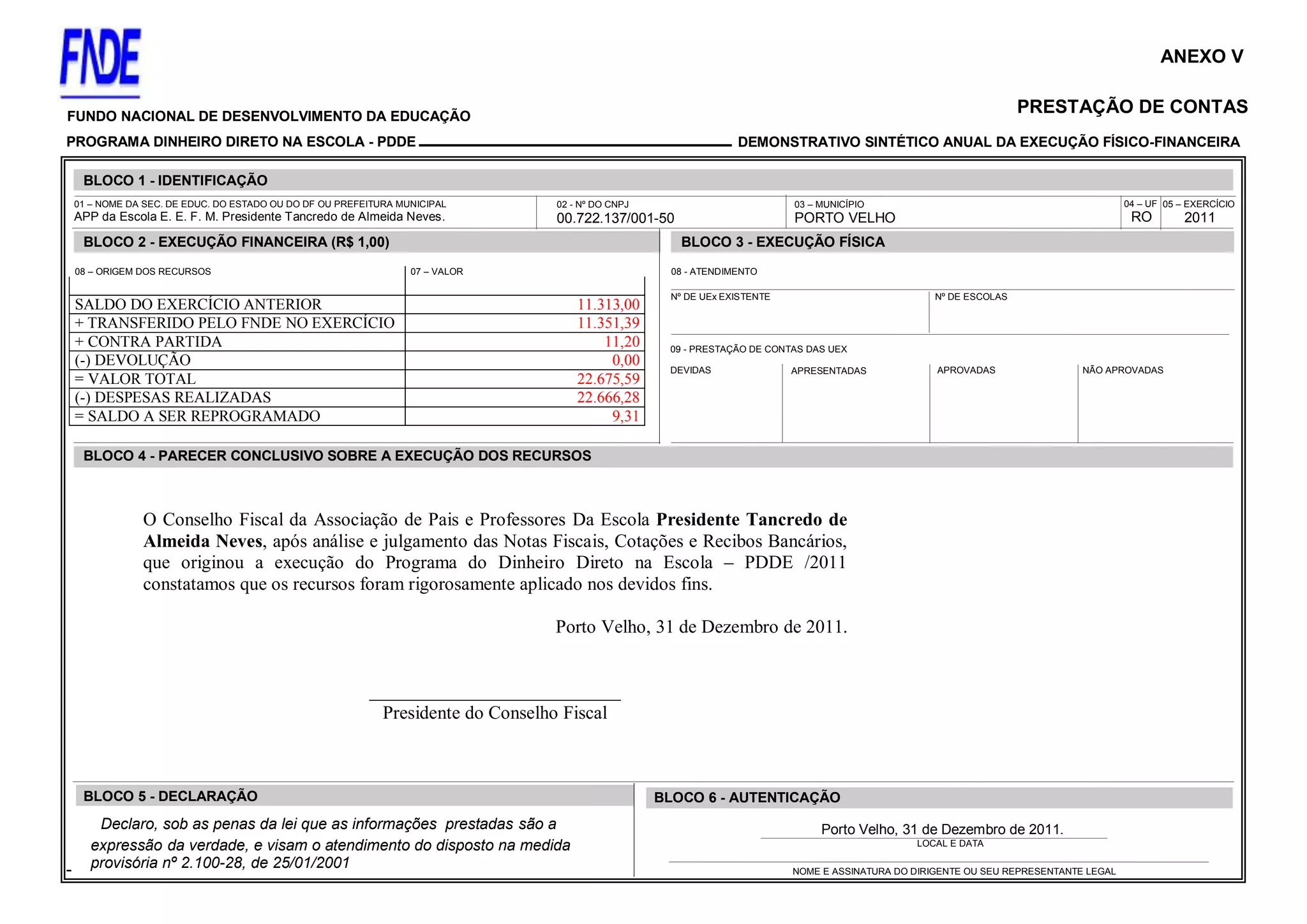 O documento apresenta o relatório financeiro e de execução física do Programa Dinheiro Direto na Escola da Escola Presidente Tancredo de Almeida Neves em 2011, demonstrando os valores recebidos, gastos e saldo remanescente, além de concluir que os recursos foram aplicados corretamente de acordo com o conselho fiscal da escola.