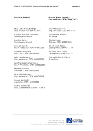 O documento lista a equipe técnica responsável pelo Estudo de Impacto Ambiental do Loteamento Residencial Lago Azul em Paulínia, SP, incluindo engenheiros agrícolas, civis, florestais, geólogos, arquitetos e técnicos ambientais.