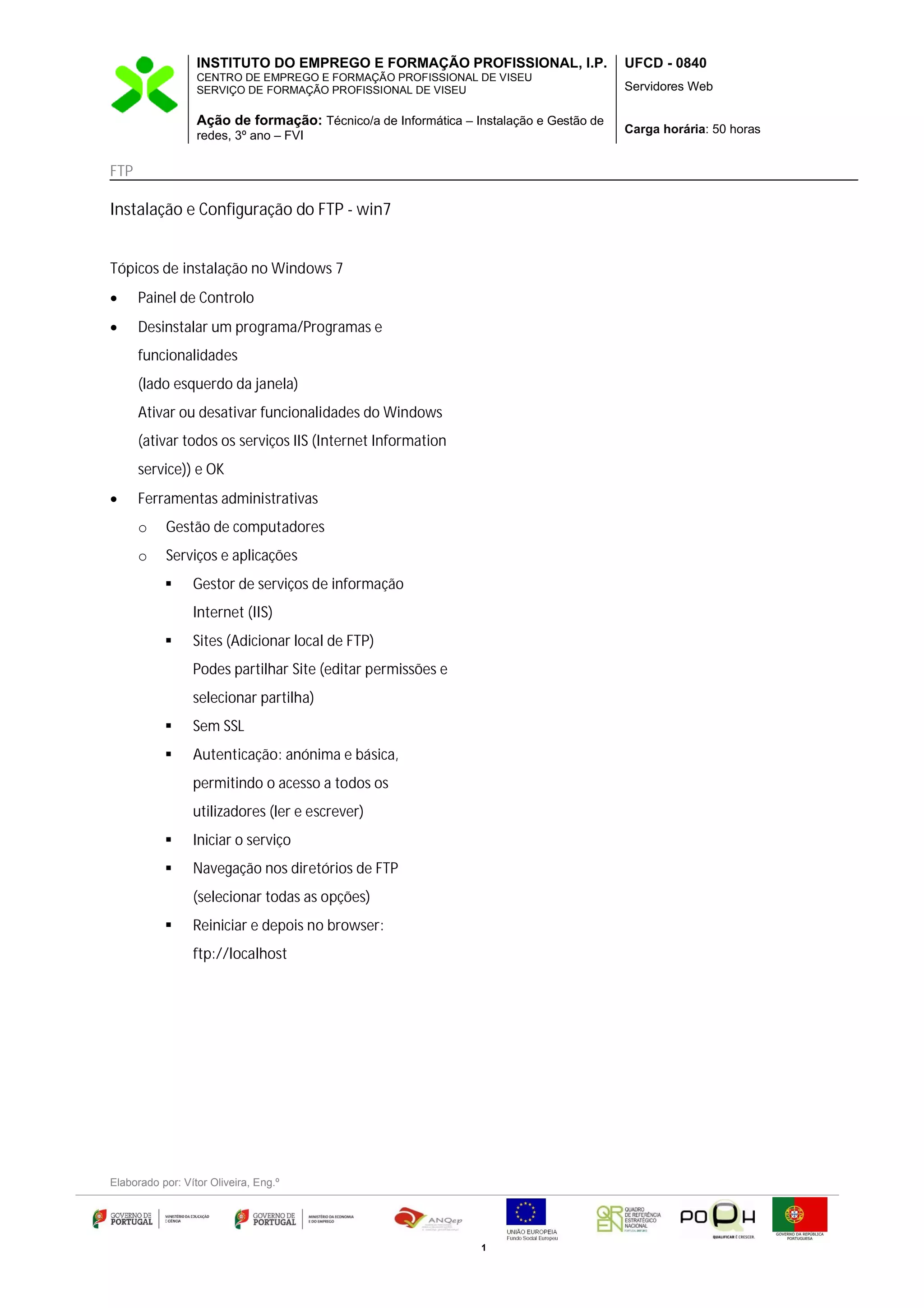 Este documento fornece instruções para instalar e configurar um servidor FTP em dois sistemas operativos: Windows 7 e Ubuntu Linux. Detalha os passos para ativar o serviço IIS no Windows 7 e instalar e configurar o vsftpd no Ubuntu, incluindo a criação de um utilizador FTP falso. Explica também como aceder ao servidor FTP via browser ou aplicação cliente após a configuração.