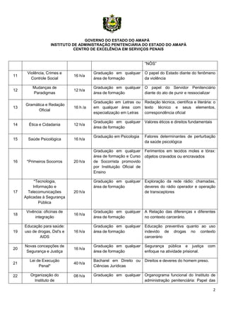 O documento lista 42 disciplinas para formação de servidores penitenciários no Amapá, incluindo: 1) Direitos humanos e os operadores de segurança pública; 2) Sistema penitenciário e política penitenciária do Amapá; 3) Primeiros socorros. Cada disciplina especifica a carga horária, formação exigida e conteúdo/apresentação.