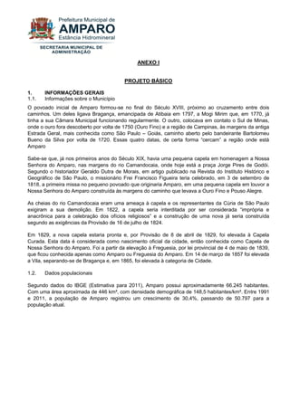 O documento fornece informações gerais sobre o município de Amparo, incluindo sua população, frota veicular e serviço de transporte coletivo. É descrito o histórico de formação do povoado e sua evolução ao longo dos séculos. Também são listadas as linhas de ônibus urbanas e rurais operadas no município, com os respectivos itinerários, horários e extensões.