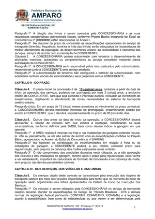 Este documento é uma minuta de contrato de concessão para a exploração e prestação de serviços de transporte público coletivo de passageiros no município de Amparo, SP. O contrato define os termos da concessão entre a prefeitura municipal e a empresa concessionária, incluindo o prazo de 15 anos para a concessão e possibilidade de prorrogação por mais 5 anos, as obrigações da concessionária em relação à frota de veículos e instalações, e as atividades a serem realizadas no âmbito da concessão.