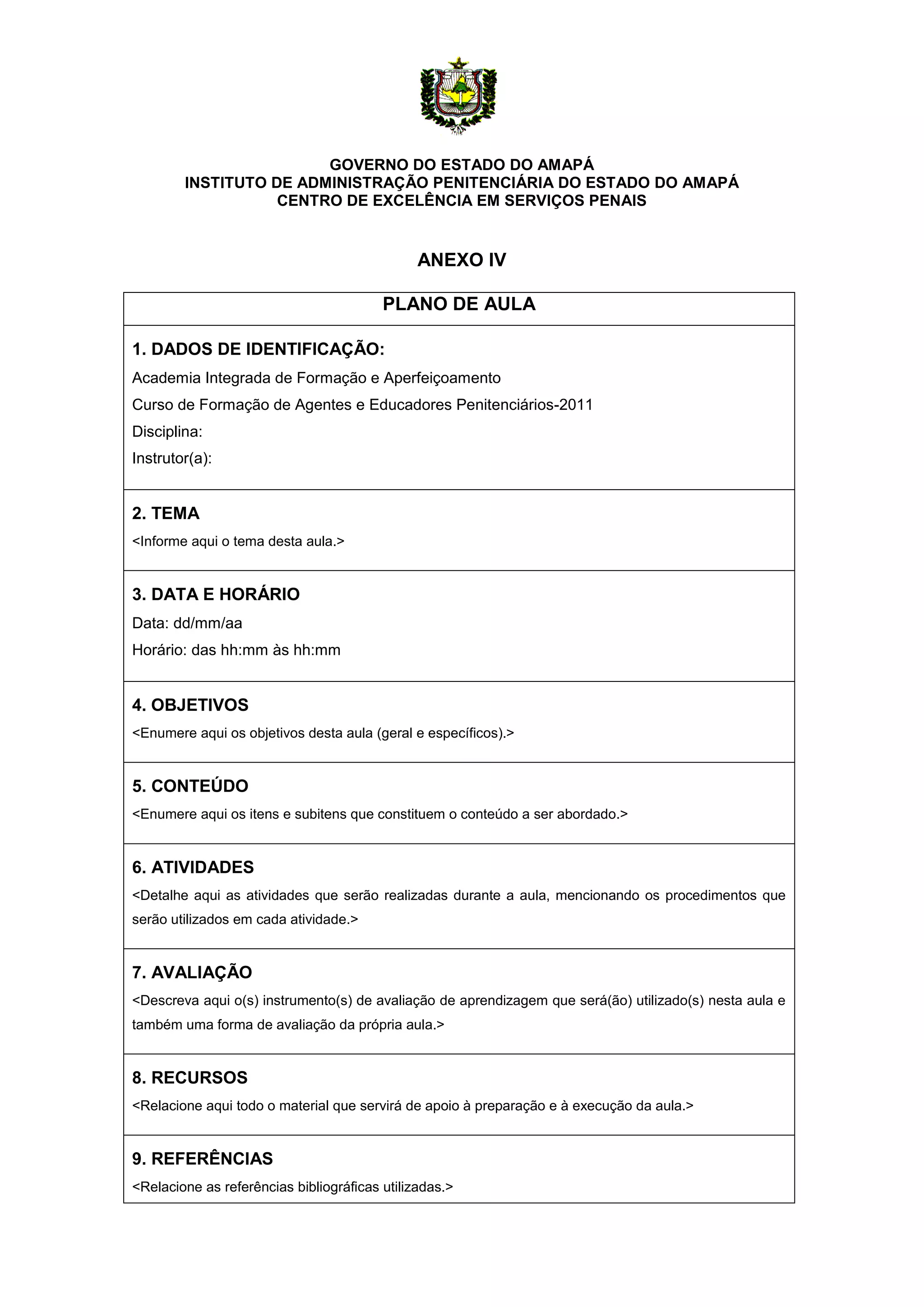 Este documento fornece um modelo de plano de aula para o Curso de Formação de Agentes e Educadores Penitenciários de 2011 no Instituto de Administração Penitenciária do Estado do Amapá. O plano de aula deve incluir dados de identificação, tema, data e horário, objetivos, conteúdo, atividades, avaliação, recursos e referências.