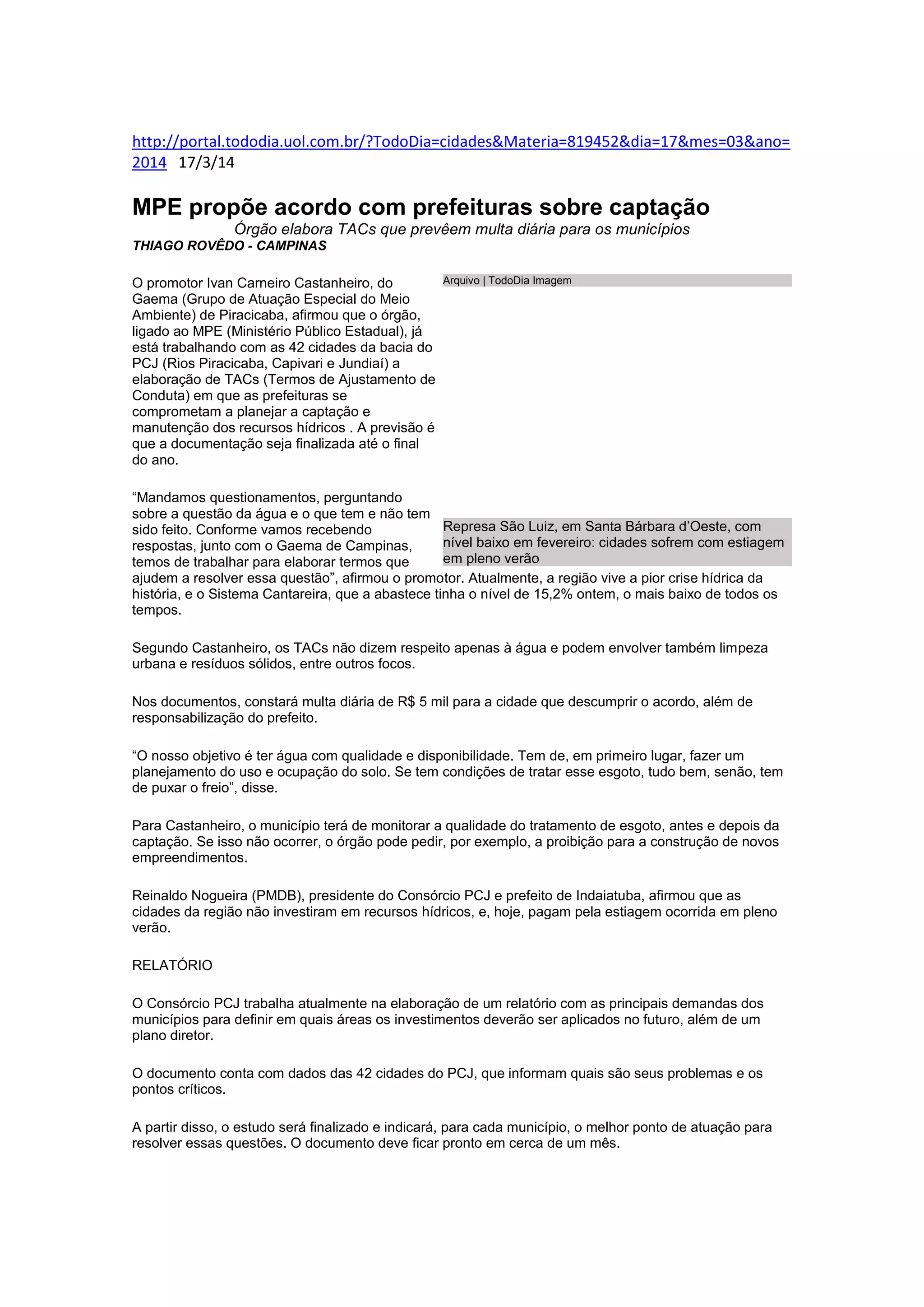 O MPE está elaborando Termos de Ajustamento de Conduta (TACs) com 42 cidades da bacia do Rio Piracicaba para que planejem a captação e manutenção dos recursos hídricos e se comprometam a multas diárias de R$5 mil caso descumpram o acordo. O Consórcio PCJ também trabalha na elaboração de um relatório e plano diretor para orientar as cidades sobre captação, distribuição e tratamento de esgoto.