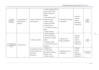 Este documento apresenta um plano de aulas para o ensino de Tecnologias de Informação e Comunicação (TIC) durante o ano letivo de 2011/2012. O plano inclui 6 módulos com unidades sobre computadores, sistemas operativos, processamento de texto, apresentações, desenho e projeções. Cada unidade descreve os objetivos, atividades, estratégias de avaliação e número de aulas necessárias.