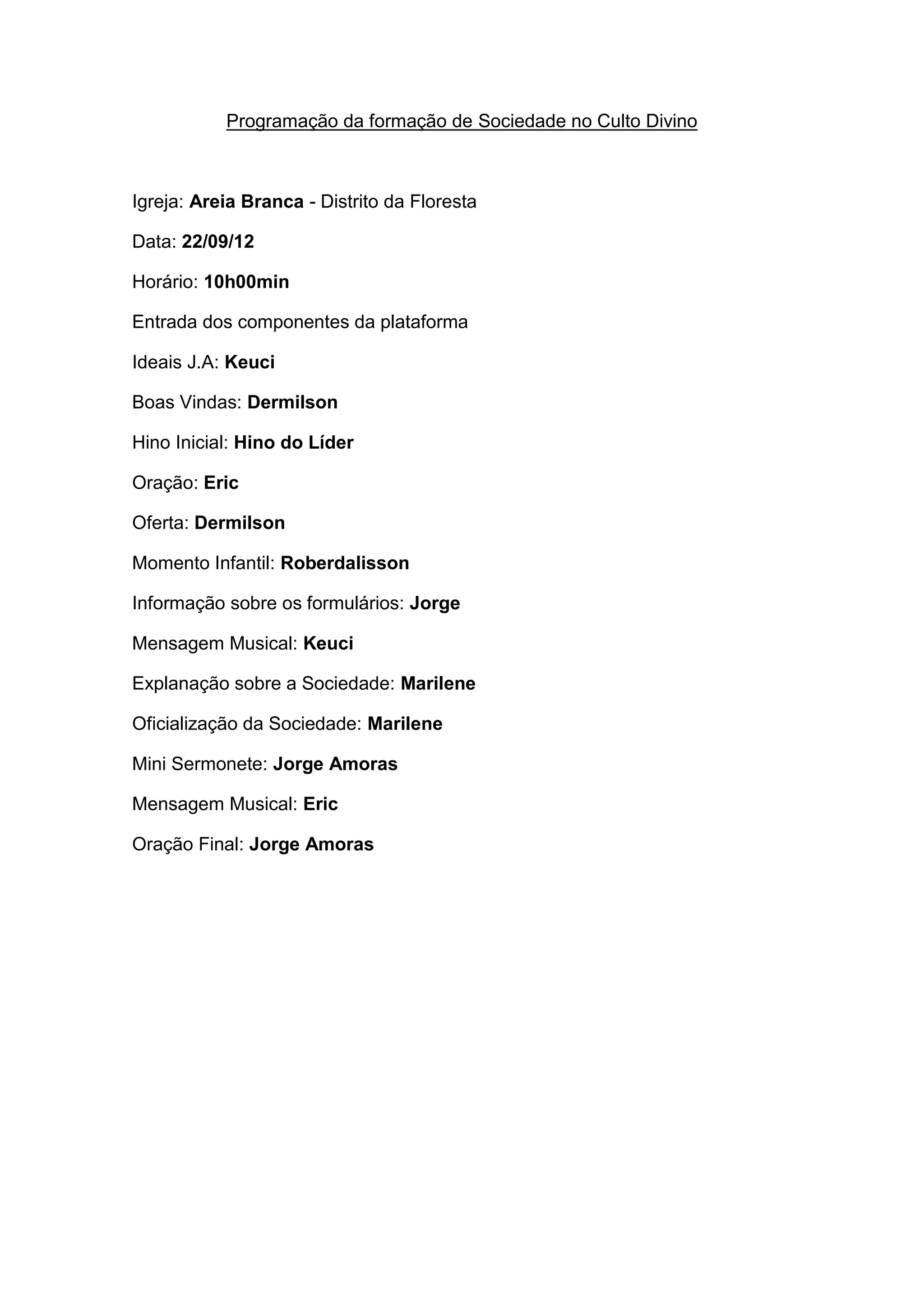 O documento descreve a programação de uma formação de Sociedade no Culto Divino de uma Igreja em 22 de setembro de 2012, incluindo as boas-vindas, orações, ofertas, mensagens musicais e explicações sobre a formação da Sociedade.
