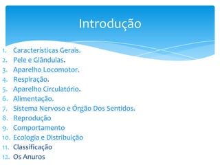 Os anfíbios são animais vertebrados que vivem em ambientes aquáticos e terrestres. Possuem pele úmida e respiratória, e a maioria passa por metamorfose ao longo de seu ciclo de vida. Dividem-se em três ordens principais: anuros como sapos e rãs, urodelos como salamandras e tritões, e ápodes como as cobras-cegas.