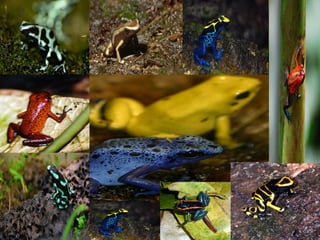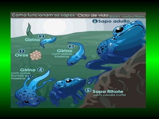 O documento descreve as principais características dos anfíbios, incluindo que eles foram os primeiros vertebrados a viver em terra, possuem pele úmida sem escamas, e respiram tanto por pulmões quanto pela pele. Os anfíbios são classificados em três grupos - anuros, urodelos e ápodes - e exemplifica cada um com espécies como sapos, rãs e salamandras. O documento também fornece curiosidades sobre a reprodução, diversidade e importância ecológica dos anfíbios.