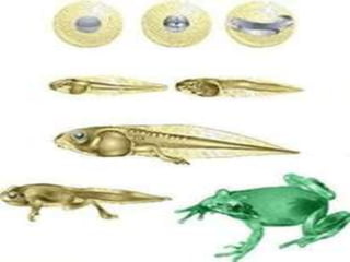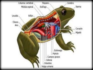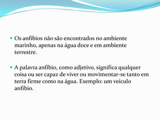 Os anfíbios vivem em ambientes aquáticos e terrestres, possuem pele úmida e podem respirar pela pele. São de sangue frio e muitos possuem membros para locomoção em terra. A reprodução é externa e as larvas se desenvolvem em água, sofrendo metamorfose para a fase adulta terrestre.
