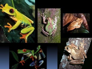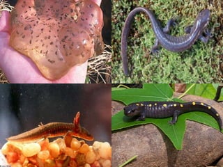 O documento descreve as características de três ordens de anfíbios: Anuros (sem cauda como sapos e rãs), Urodelos (com cauda como salamandras) e Ápodos (sem patas como cobra-cega). Detalha o ciclo de vida dos anfíbios, desde a reprodução e desova até a metamorfose dos girinos em adultos terrestres, e descreve suas principais características físicas.