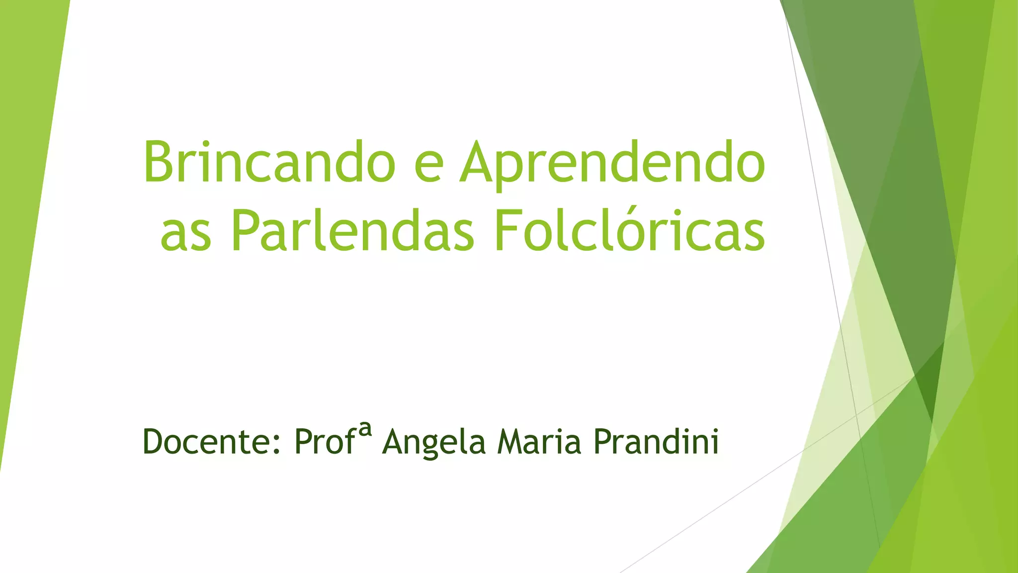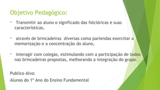 Este documento descreve uma aula sobre parlendas folclóricas brasileiras para alunos do 1o ano do ensino fundamental. O objetivo é ensinar sobre esta tradição cultural através de brincadeiras, exercícios de memorização e interação entre os alunos. As atividades incluem explicar rimas, assistir a um vídeo sobre uma parlenda e brincar de "pega-pega" usando versos de parlendas.