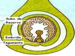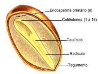 O documento descreve as características das angiospermas e as diferenças entre monocotiledôneas e dicotiledôneas. As angiospermas são plantas com sementes protegidas por um fruto. Elas incluem mais de 230 mil espécies e são o grupo mais moderno e numeroso de plantas. As monocotiledôneas têm embrião com um cotilédone, raiz fasciculada e folhas paralelinérveas. As dicotiledôneas têm embrião com dois ou mais cotilédones, raiz axial e folhas