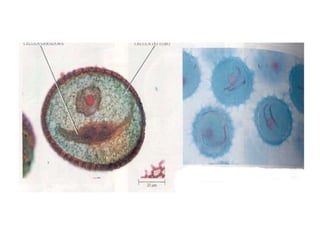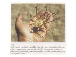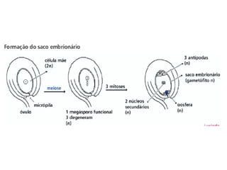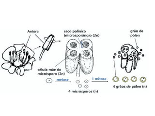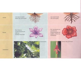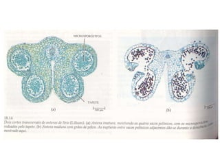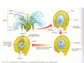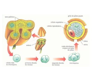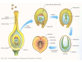 Angiospermas, ou plantas com flores, possuem características compartilhadas com as gimnospermas como grãos de pólen e sementes, mas se diferenciam por terem flores, frutos e realizarem a dupla fecundação. As angiospermas representam cerca de 235.000 espécies e possuem adaptações como a polinização e a dispersão de sementes que contribuem para sua grande diversidade e sucesso ecológico.