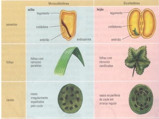 As angiospermas compartilham características como grãos de pólen e sementes com as gimnospermas. As características exclusivas das angiospermas incluem a flor, fruto e dupla fecundação. Existem cerca de 220.000 espécies descritas de angiospermas, que se diferenciam das gimnospermas principalmente pela presença de flor, fruto e ausência de anterídeos e arquegônios.