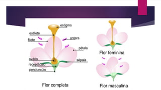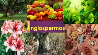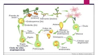 O documento explora as características das angiospermas, destacando as funções das raízes, caules e folhas, além de descrever a estrutura das flores e frutos. As raízes têm funções como fixação, absorção e armazenamento, enquanto os caules sustentam a planta e conduzem substâncias. As flores e frutos são essenciais para a reprodução e proteção das sementes, classificando-se em diferentes tipos de frutos simples e compostos.