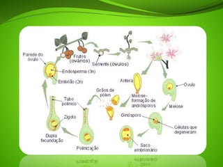 (1) Angiospermas são plantas com flores e frutos que protegem as sementes. Após a fecundação, os óvulos formam as sementes e os ovários formam os frutos.