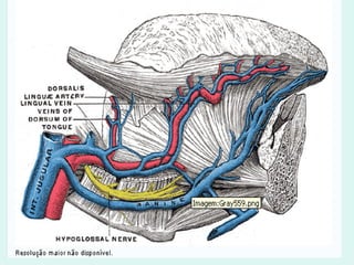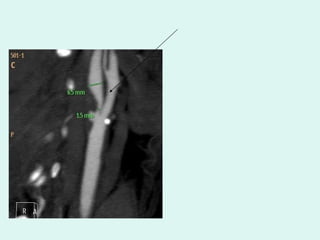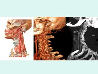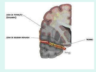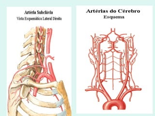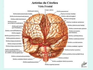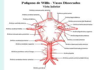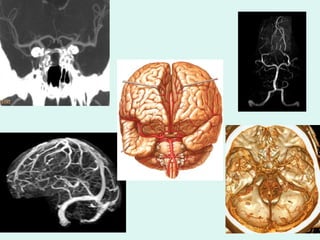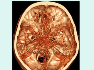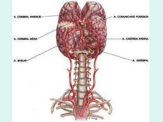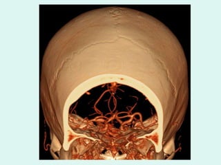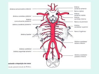 O documento discute a anatomia e fisiologia da circulação cerebral, incluindo os principais vasos sanguíneos que irrigam o cérebro e o retorno venoso. Também aborda patologias como acidente vascular cerebral (AVC), aneurismas e métodos de diagnóstico por imagem como arteriografia, angiorressonância magnética e doppler.