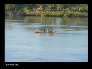 Este documento lista diversos locais e pontos turísticos notáveis de Angola, incluindo rios como o Kwanza e Cunene, quedas d'água como as de Calandula e Montenegro, formações naturais como o Deserto do Namibe e a Serra da Chela, paisagens como o Vale do Kwanza e a Savana da Reserva do Iona, e cidades como Luanda e Lubango.