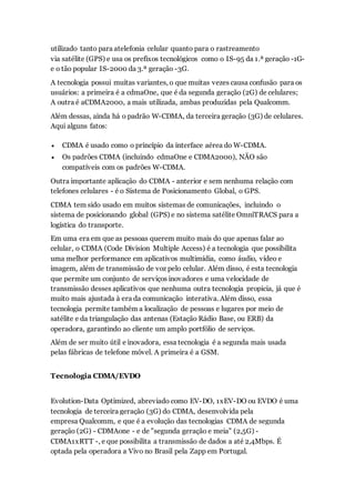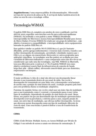 Angolatelecom oferece serviços de voz e dados através de cabos e sem fio usando tecnologia WiMAX. O documento descreve o padrão WiMAX e como ele estabelece a infraestrutura para banda larga, permitindo velocidades acima de 1 Gbps. Também discute CDMA e como ele é usado em telefonia celular e sistemas de posicionamento global.