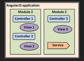 O documento descreve conceitos fundamentais do framework AngularJS, incluindo módulos, controllers, factories e views. Também introduz o conceito de componentes AngularJS, que permite agrupar controllers e views em componentes reutilizáveis.