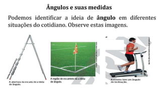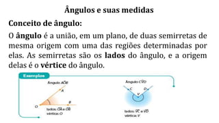 O documento discute ângulos e suas medidas. Explica que um ângulo é formado por duas semirretas com origem comum e vértice. Detalha como medir ângulos em graus usando um transferidor. Classifica ângulos em retos, agudos e obtusos de acordo com sua medida.