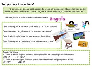 O documento apresenta conceitos básicos sobre ângulos, incluindo: