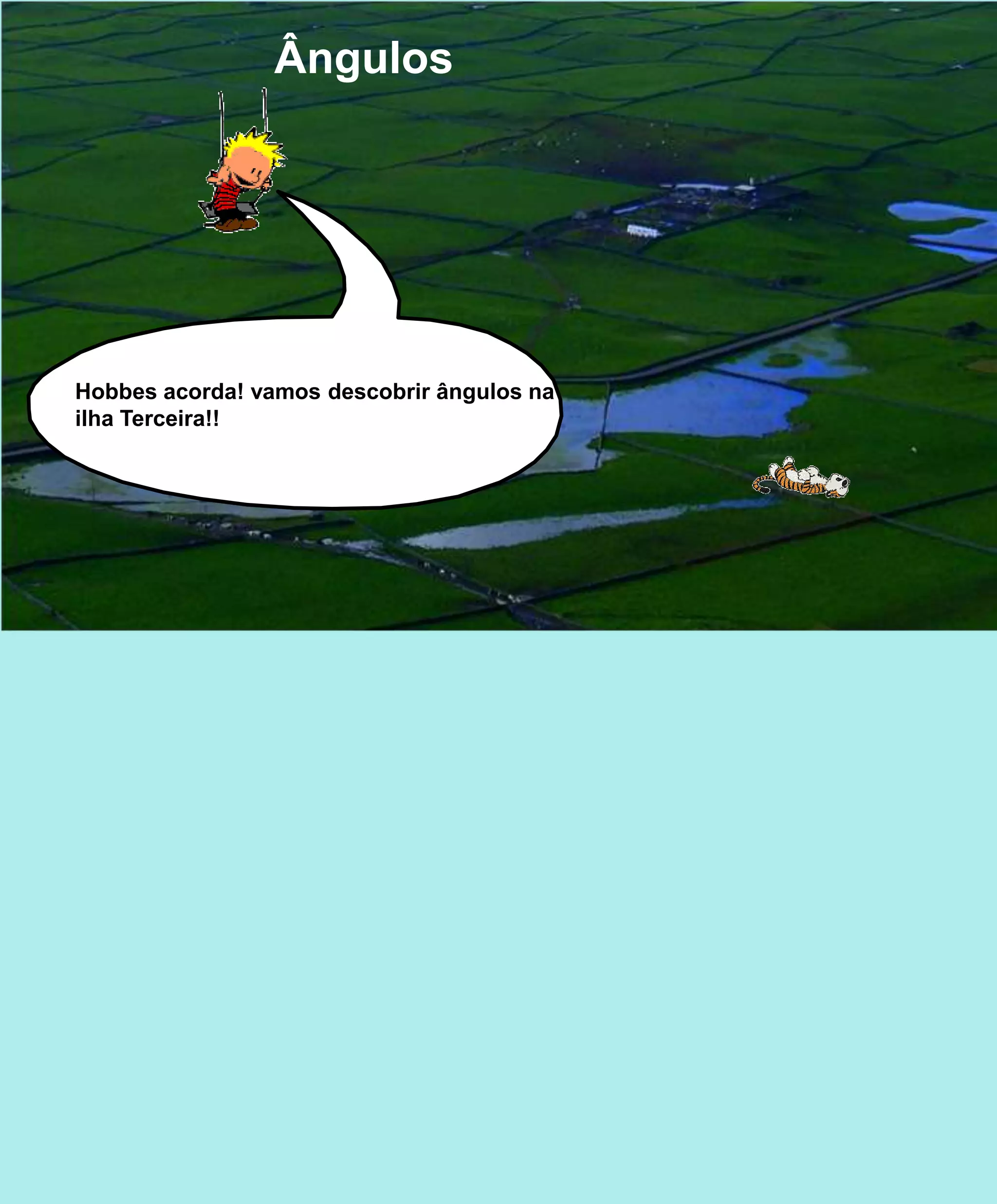 O documento fala sobre ângulos e descobre diferentes tipos de ângulos como agudo, obtuso e reto em uma ilha. Ele menciona que Hobbes acorda para descobrir ângulos e que Calvin encontrou um ângulo enorme, perguntando se algum ângulo teria maior amplitude.