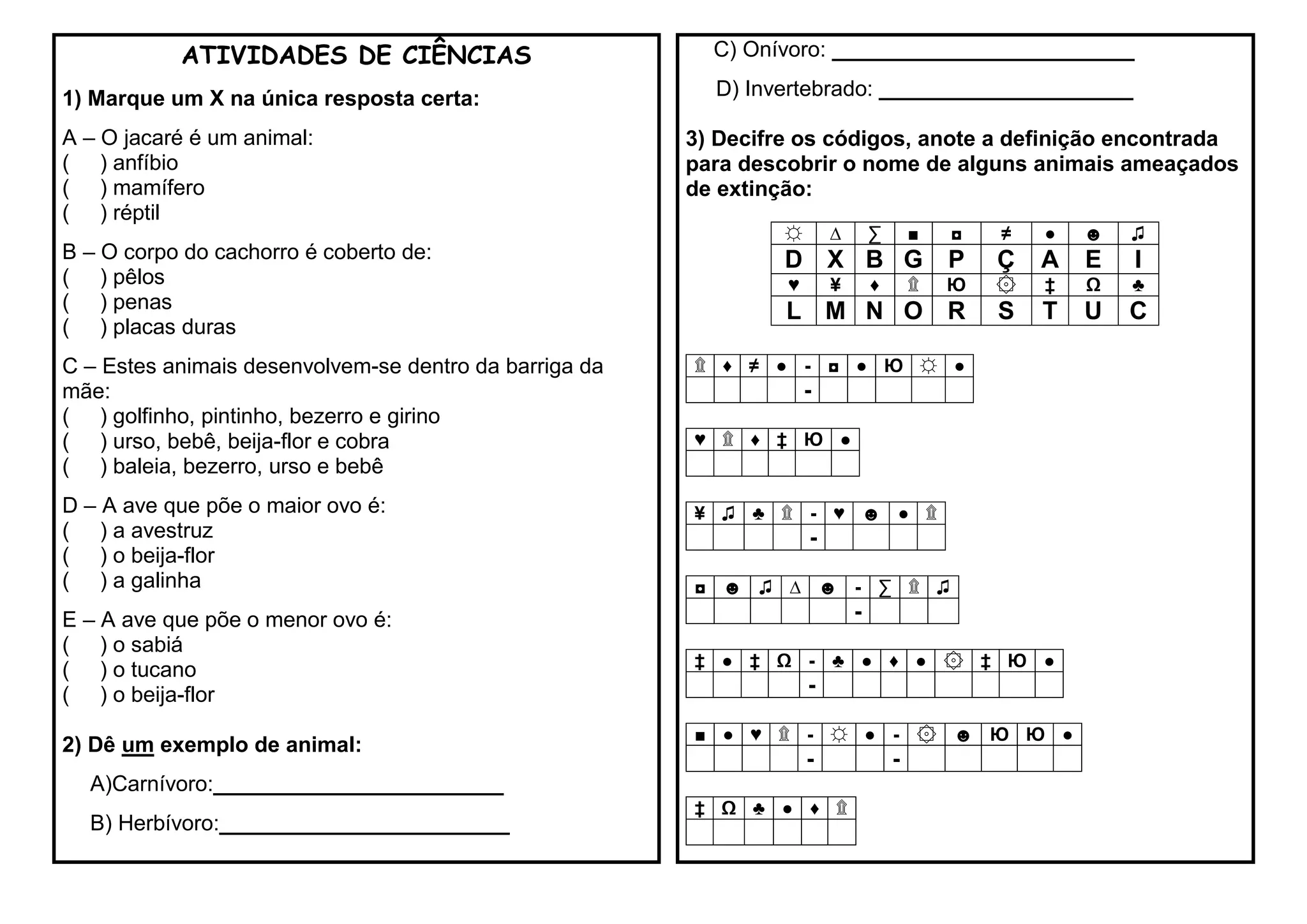 O documento apresenta questões sobre animais para crianças responderem. A primeira pergunta trata de classificar animais como jacaré, cachorro, golfinho e bezerro. A segunda pede exemplos de carnívoro, herbívoro e onívoro. A terceira traz códigos a serem decifrados para revelar nomes de animais ameaçados de extinção.