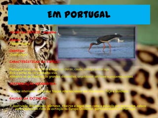 A cegonha negra está em risco de extinção em Portugal devido à destruição de seu habitat natural de bosques, pântanos e ribeiros pela ação humana e poluição por pesticidas. A lontra também está ameaçada pela destruição de zonas úmidas e o lince-ibérico enfrenta riscos pela redução do coelho-bravo e perda de habitat mediterrâneo.