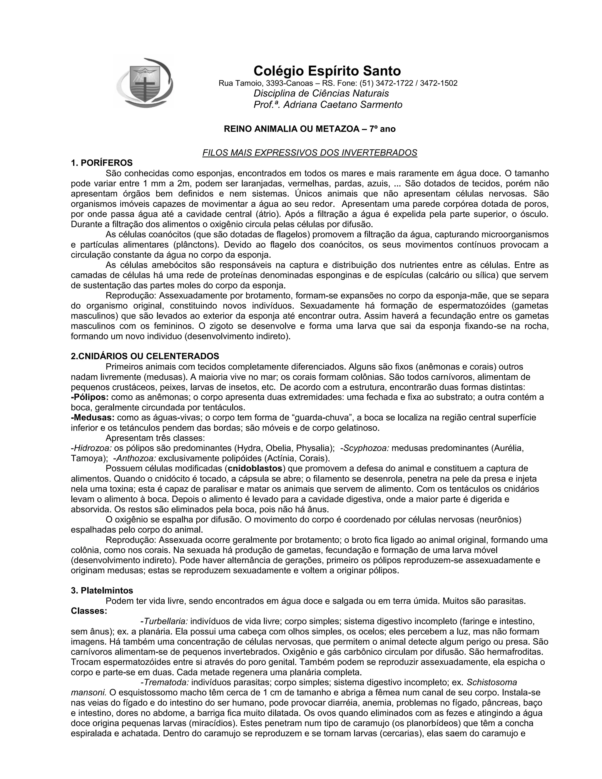 1) O documento descreve os principais filos de invertebrados, incluindo poríferos, cnidários, platelmintos, nematelmintos e anelídeos.