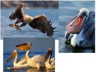 O documento descreve as características de aves e mamíferos. Aves possuem asas, penas, são homeotérmicas e ovíparas. Seu esqueleto é leve e resistente. Mamíferos possuem glândulas mamárias, são vivíparos ou ovíparos, e possuem pele com glândulas. Ambos são herbívoros, carnívoros ou onívoros e têm digestão completa.
