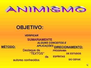 1. O documento discute os conceitos de animismo e como ele se relaciona com o Espiritismo, apresentando definições e exemplos de fenômenos anímicos.