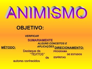 O documento discute os conceitos de animismo e espiritismo, comparando e relacionando os dois fenômenos. Apresenta definições de animismo fornecidas por Allan Kardec e outros autores, e discute como os fenômenos animísticos podem estar presentes no espiritismo e na mediunidade. Também aborda a influência do médium e do meio ambiente na produção e interpretação dos fenômenos.