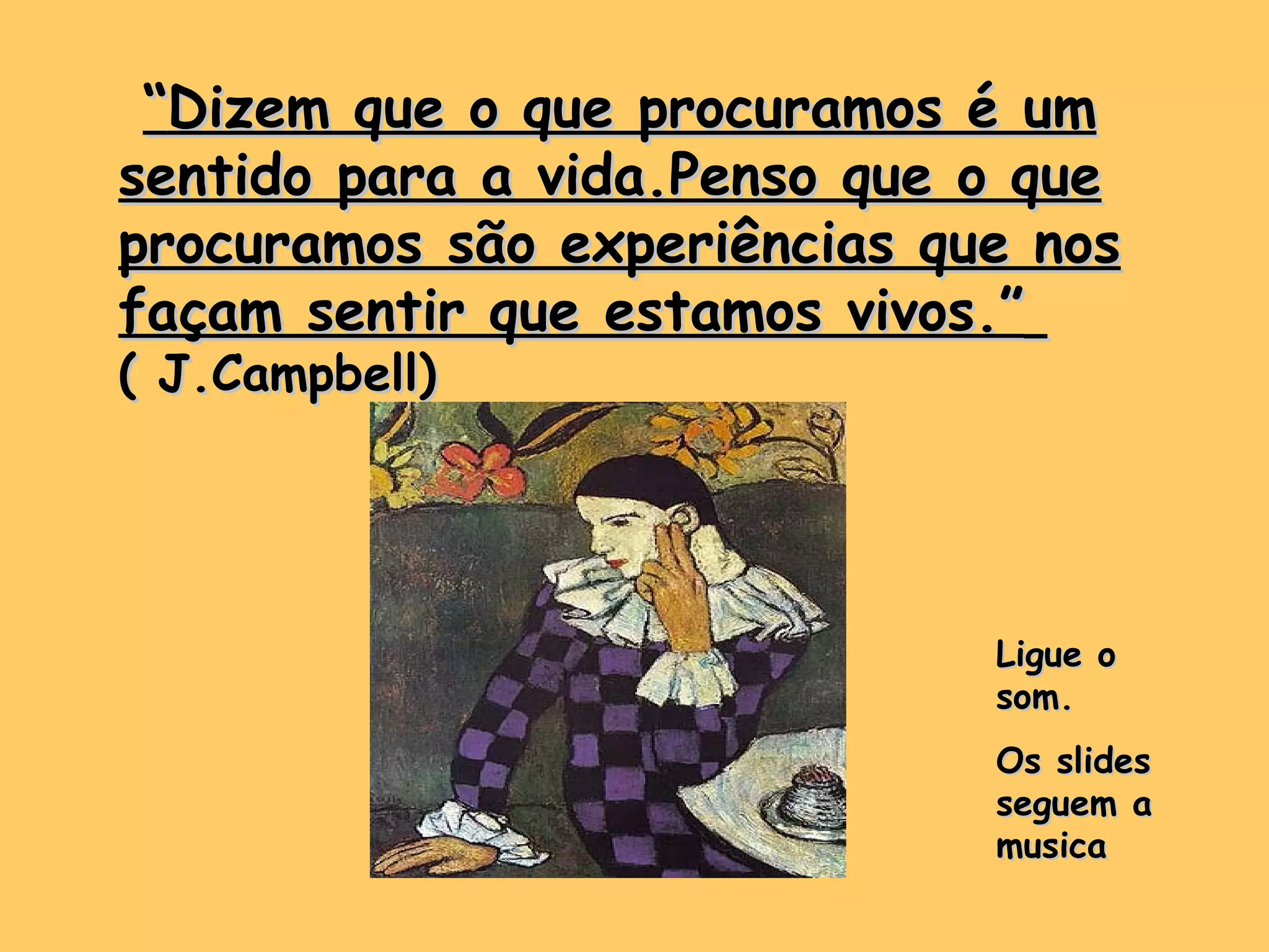 “ Dizem queo que procuramos é um sentido para a vida.Penso que o que procuramos são experiências que nos façam sentir que estamos vivos.” ( J.Campbell) Ligue o som. Os slides seguem a musica