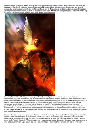 O documento discute anjos caídos, demônios e nefilins de acordo com a teologia cristã e outras perspectivas. Explica que anjos caídos são anjos que se rebelaram contra Deus, como Lúcifer, e que alguns teriam procriado com humanos gerando nefilins. Também aborda perspectivas católica e protestante sobre Lúcifer e outros anjos caídos como Azazel.