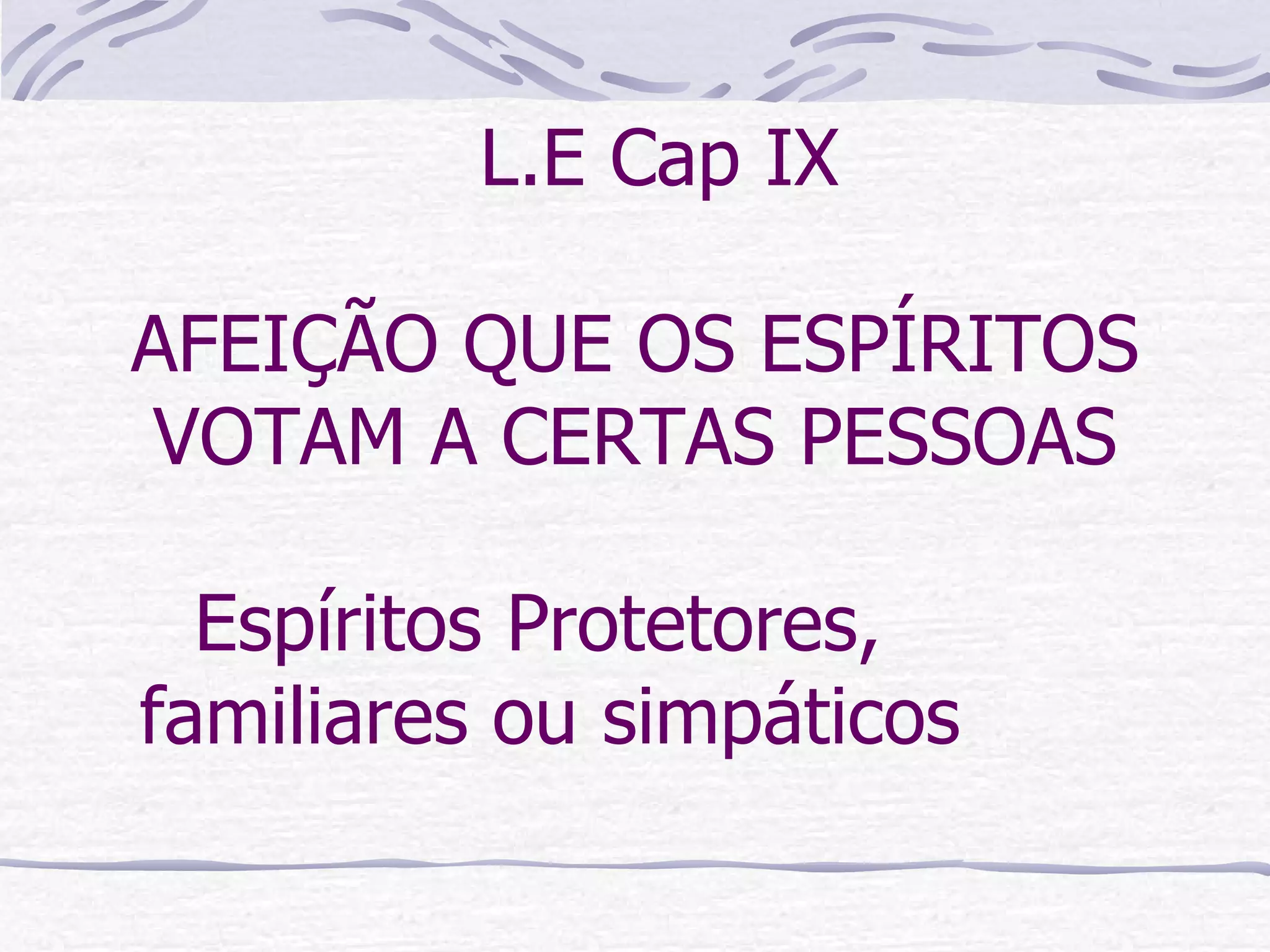 O documento discute os conceitos de espíritos protetores, familiares e simpáticos segundo o Espiritismo. Espíritos protetores são parentes ou amigos que nos precederam e nos protegem, enquanto espíritos familiares se ligam a certas pessoas para ajudá-las. O documento também aborda como os espíritos se sentem atraídos por pessoas de sentimentos semelhantes e como a sociedade pode afastar espíritos inferiores atraindo os bons à medida que se aperfeiçoa moralmente.