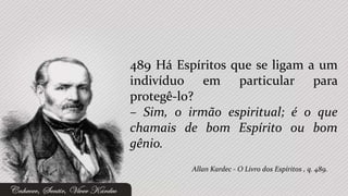 Este documento discute a existência de espíritos protetores que guiam os indivíduos e grupos. Ele explica que cada pessoa tem um espírito protetor desde o nascimento, cuja missão é ajudar e conselhar. No entanto, esses espíritos respeitam o livre arbítrio e não interferem de forma ostensiva. O documento também menciona que grupos como sociedades e nações possuem seus próprios espíritos protetores.