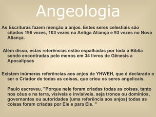 O documento discute a existência e características dos anjos segundo a Bíblia. Ele explica que os anjos foram criados por Deus antes da criação da Terra e servem a Deus. Também descreve a hierarquia dos anjos, com diferentes classes como serafins, querubins e arcanjos, que governam sob a autoridade de Deus.