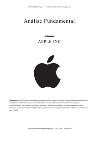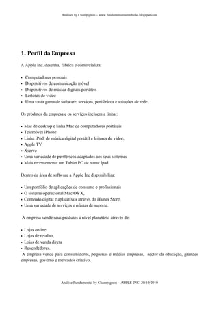 O documento fornece uma análise fundamental da empresa Apple Inc. focando-se no seu perfil, modelo de negócio, balanço financeiro sólido, crescimento contínuo das vendas e lucros, e perspectivas positivas para os próximos anos com o lançamento de novos produtos.