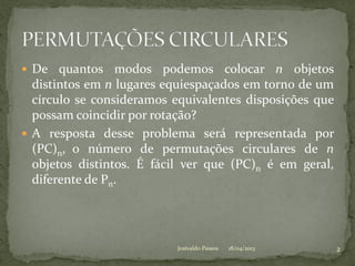 O documento discute diferentes formas de contar permutações circulares e combinações completas. Explica que o número de modos de colocar n objetos em um círculo é dado por (PC)n, e que (PC)n é diferente de Pn. Também mostra que o número de modos de escolher p objetos entre n é dado por nC p.