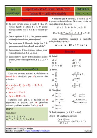 O documento apresenta os conceitos fundamentais de análise combinatória, incluindo arranjos e combinações simples. É introduzido o princípio fundamental da contagem para a resolução de problemas que envolvem escolhas sucessivas. Exemplos ilustram como calcular o número de possibilidades para diferentes ações constituídas de múltiplas etapas. Fórmulas recursivas são apresentadas para calcular arranjos e combinações.